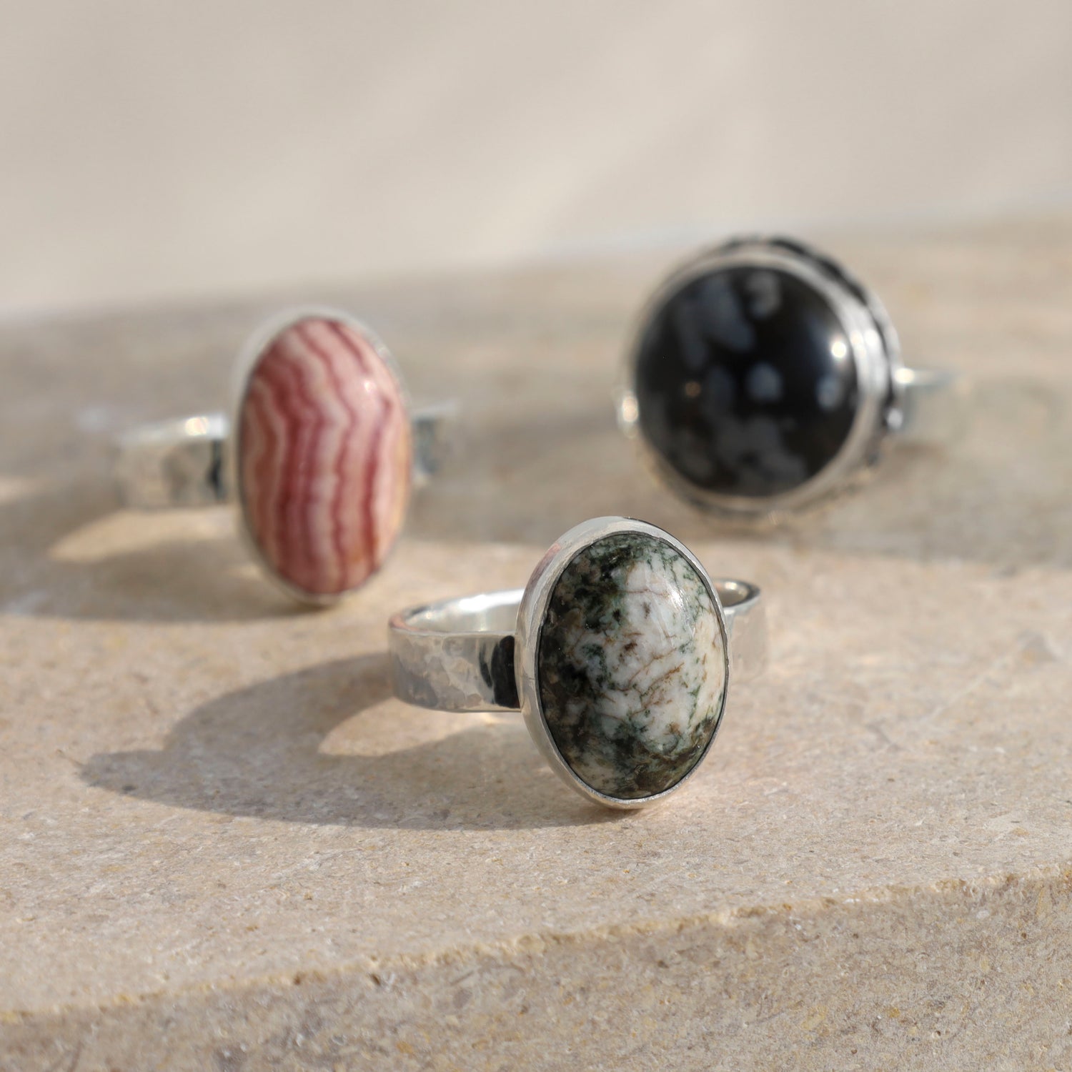 A selection of sterling silver rings with semi-precious stones. All pieces are...