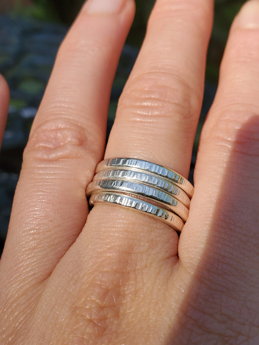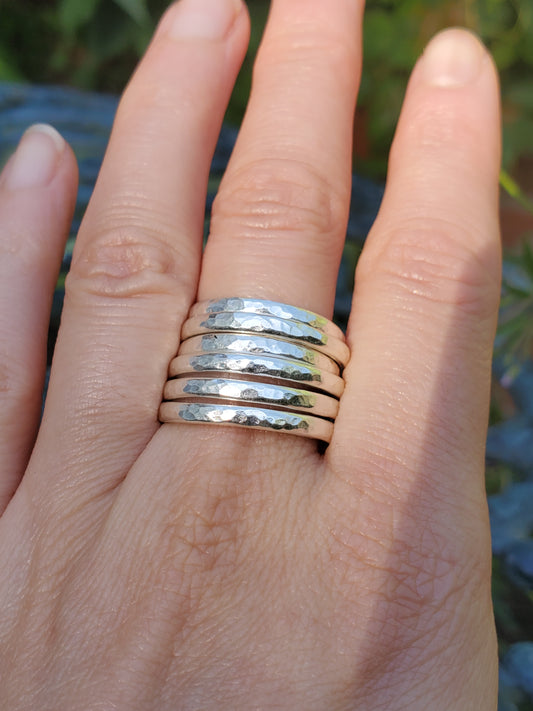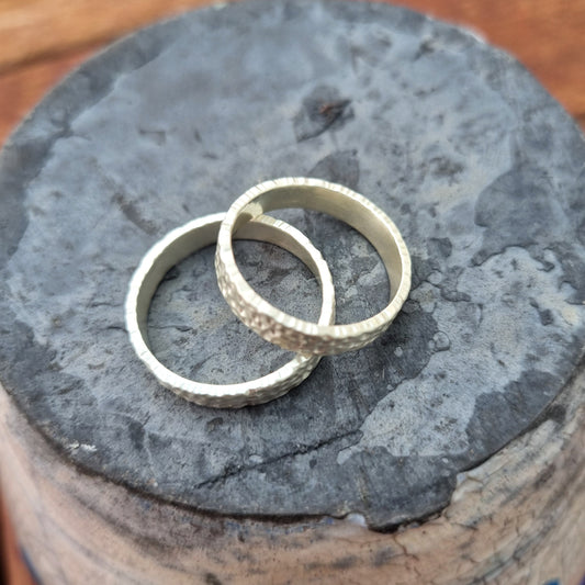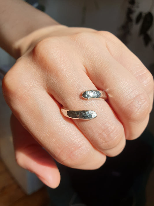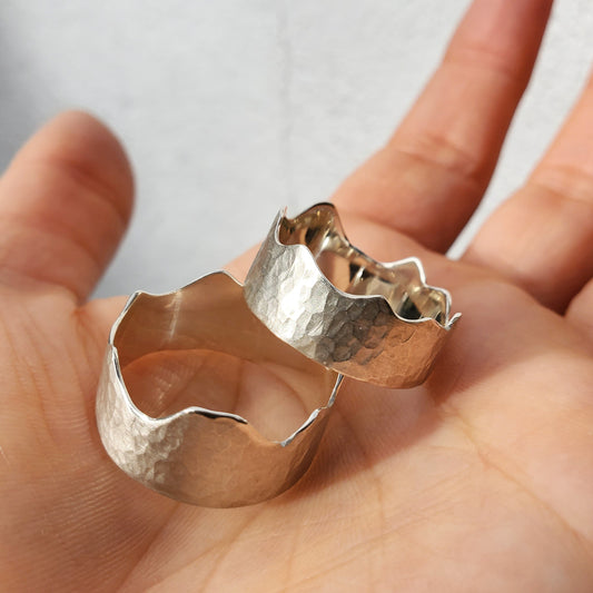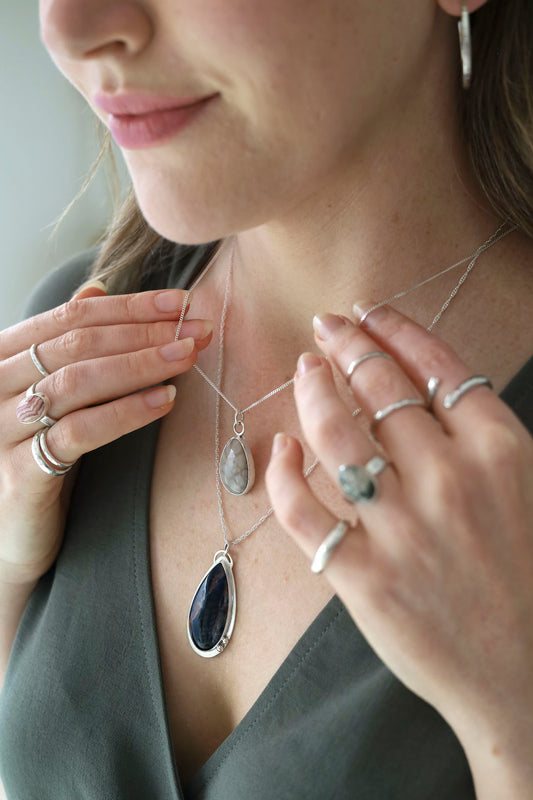 A collection of sterling silver pieces, featuring recycled metal and compromising of rings, pendants, earrings, and bangles.